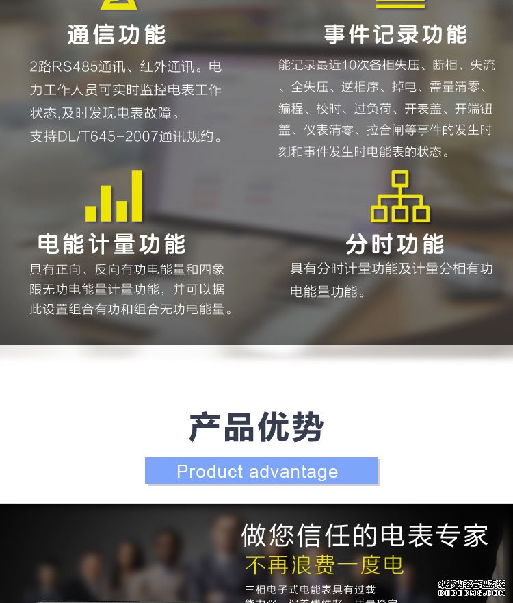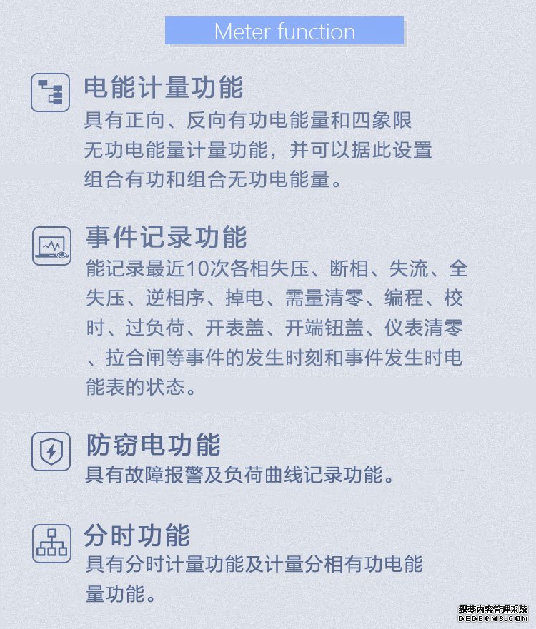 - 主要功能:有功,功率因素,有功功率,無功功能,視在功率,四象限無功,電壓,電流,事件報警,費控,需量
