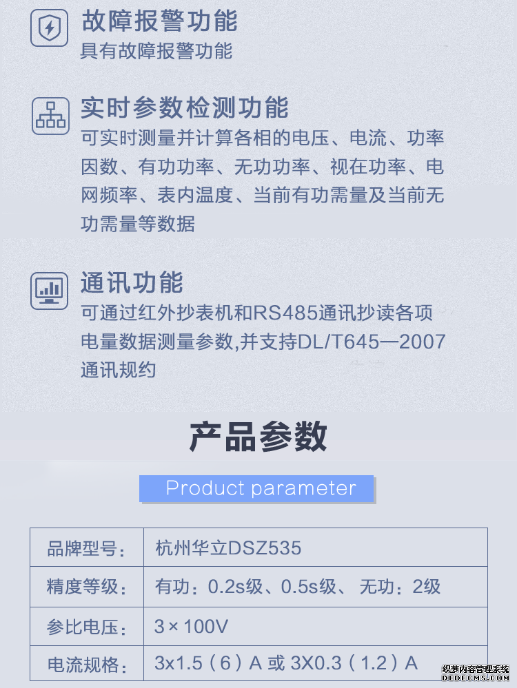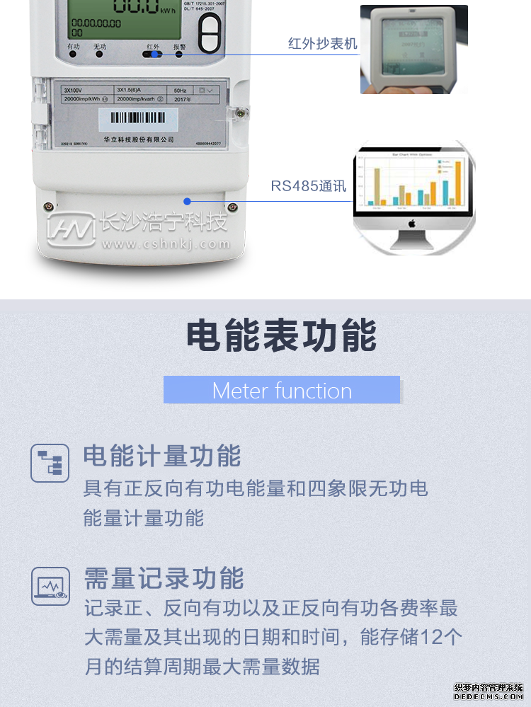 - 主要功能:有功,功率因素,有功功率,無功功能,視在功率,四象限無功,電壓,電流,事件報警,需量