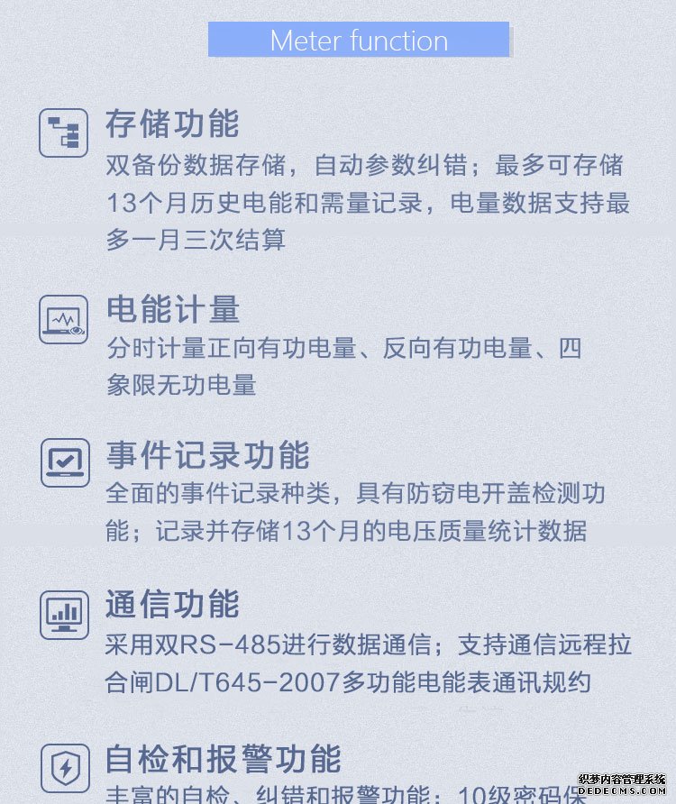 - 主要功能:有功,功率因素,有功功率,無功功能,四象限無功,電壓,電流,事件報警,需量