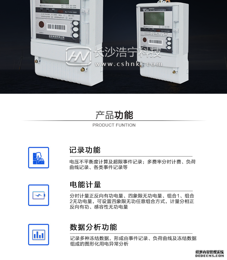 - 主要功能:有功,功率因素,有功功率,無功功能,視在功率,四象限無功,電壓,電流,事件報警,載波,需量,諧波